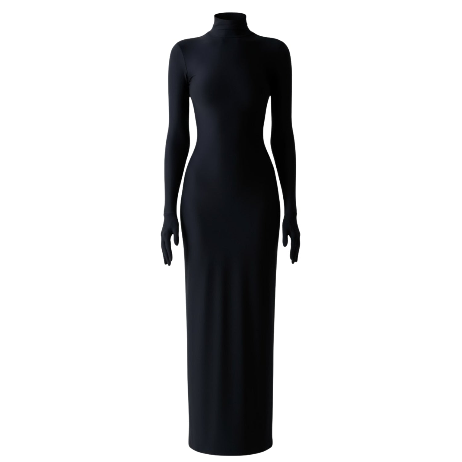A bodycon shaping maxi dress with long sleeves and attached gloves. Ditch the shape-wear beacuse this dress does it all. This sexy backless dress is Perfect for a cocktail event, a date night outfit or as a little black party dress. Spotted on influencers and Celebs it is a wardrobe staple.