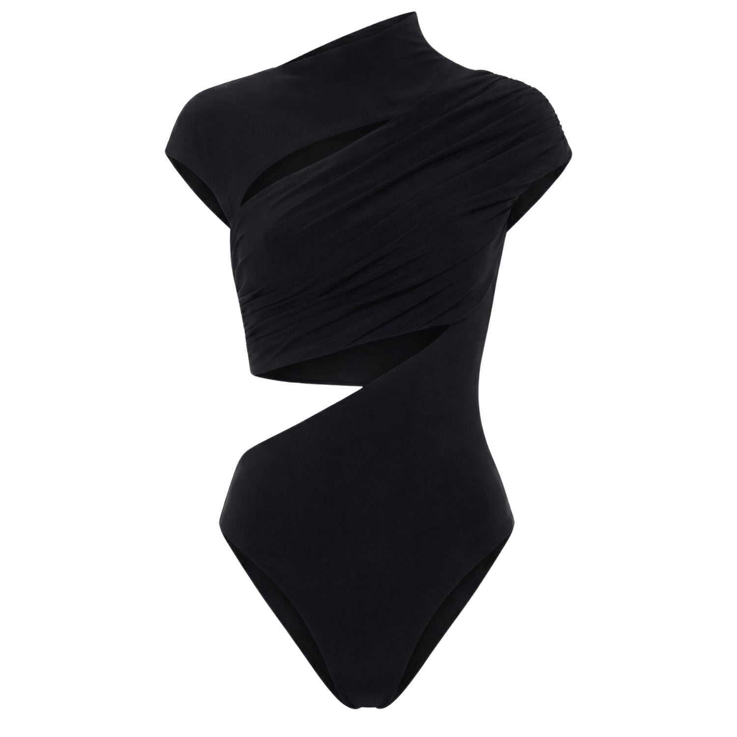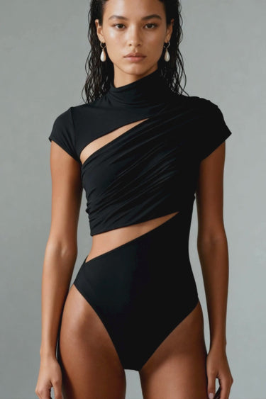 Elevate your wardrobe with this elegant black bodysuit, designed to make a bold statement. Featuring sharp cut-outs and elegant draping, this piece flatters your silhouette while offering a chic, modern look. The thong design ensures a seamless fit, while capped sleeves add a touch of sophistication. Perfect for pairing with high heels, this bodysuit is ideal for both day and night outings, making it a versatile addition to any fashion-forward closet.