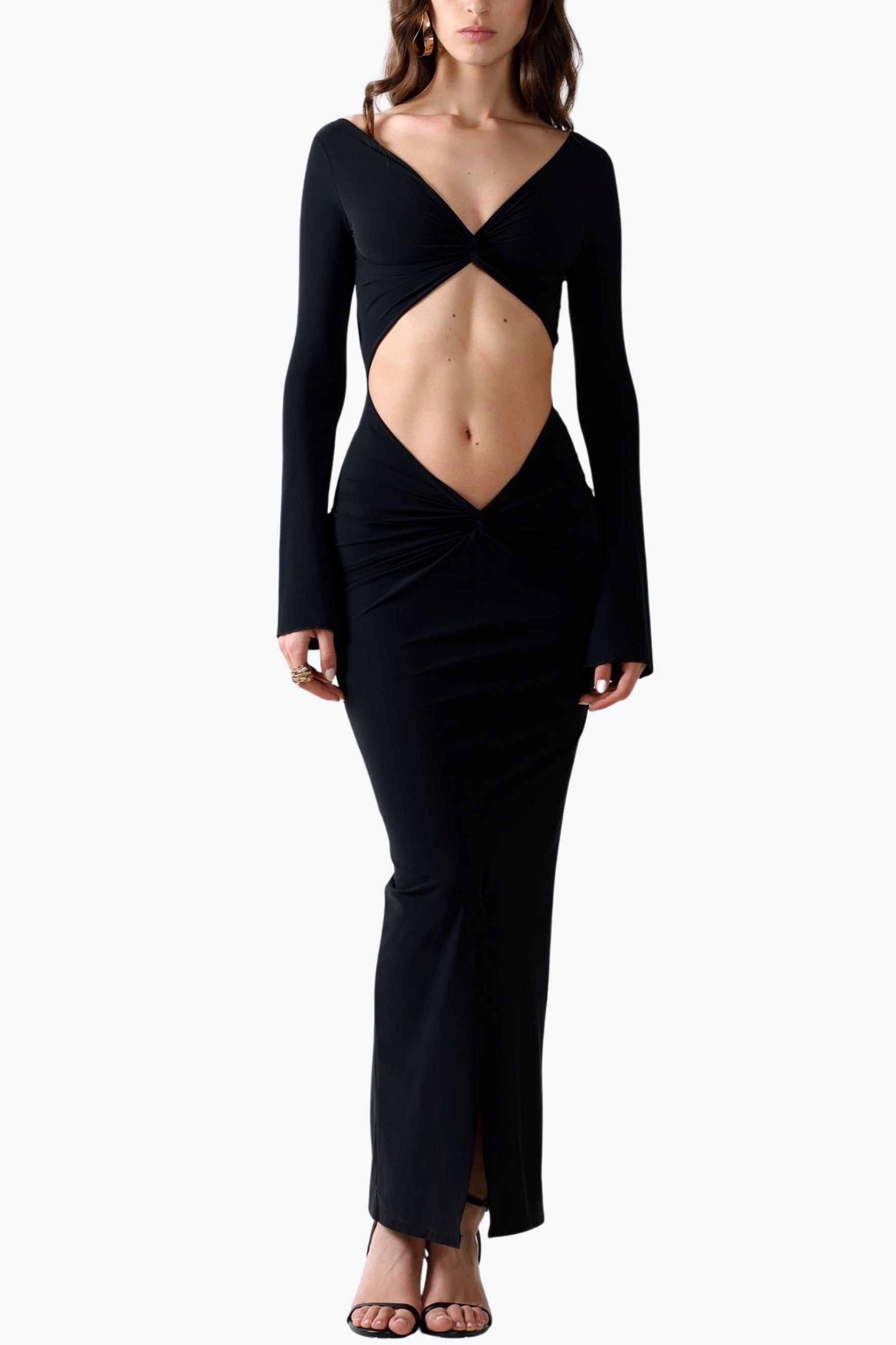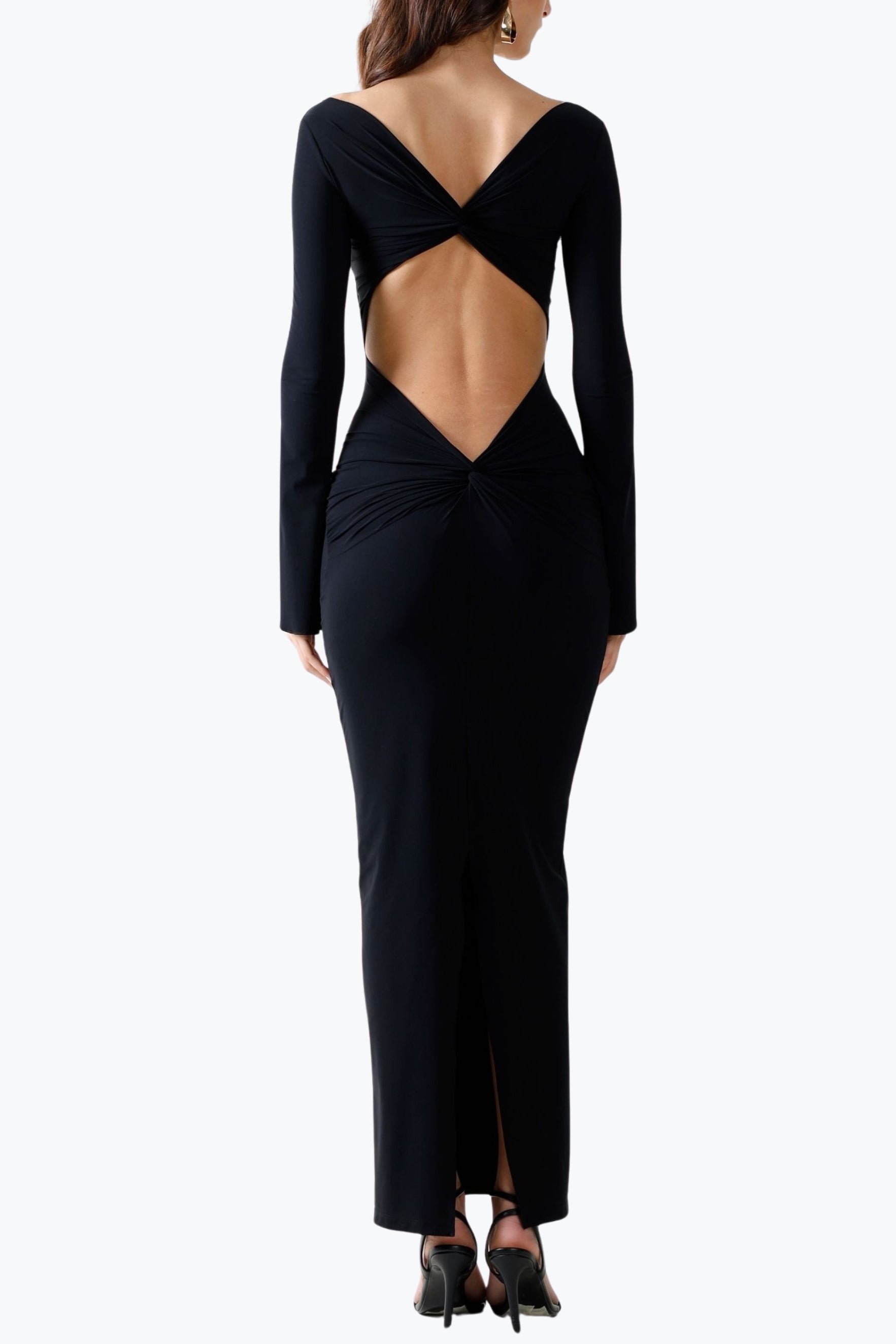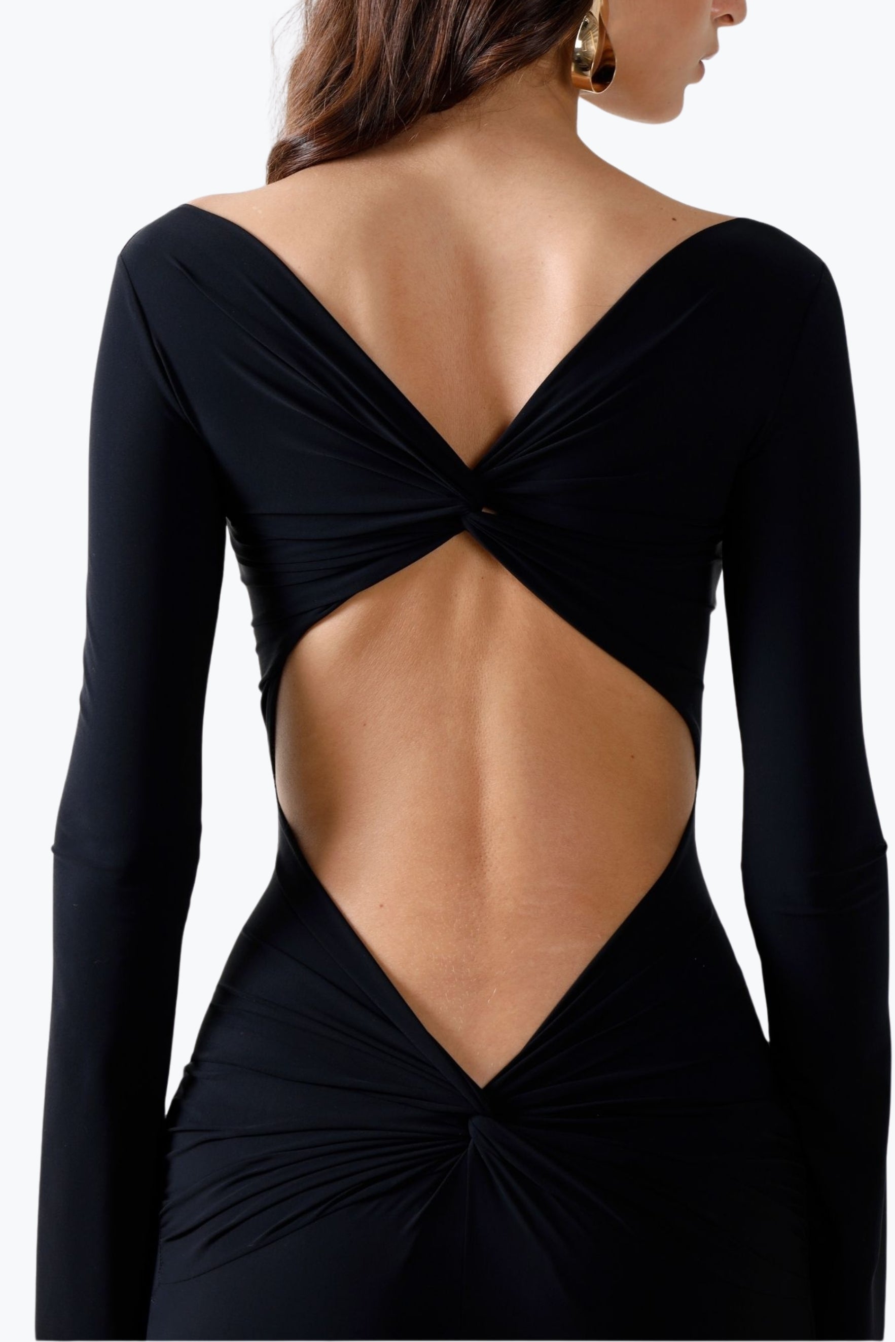 This piece is so versatile as you can wear it the other way around, making it a 2 in 1 dress. Featuring a sophisticated low back design and long sleeves for a chic look. The square neck adds a touch of class, while the open back detail enhances its allure. Perfect for any occasion, this maxi dress is a versatile addition to your wardrobe. Embrace style and comfort with our stunning maxi dress.