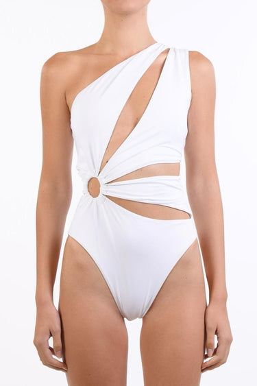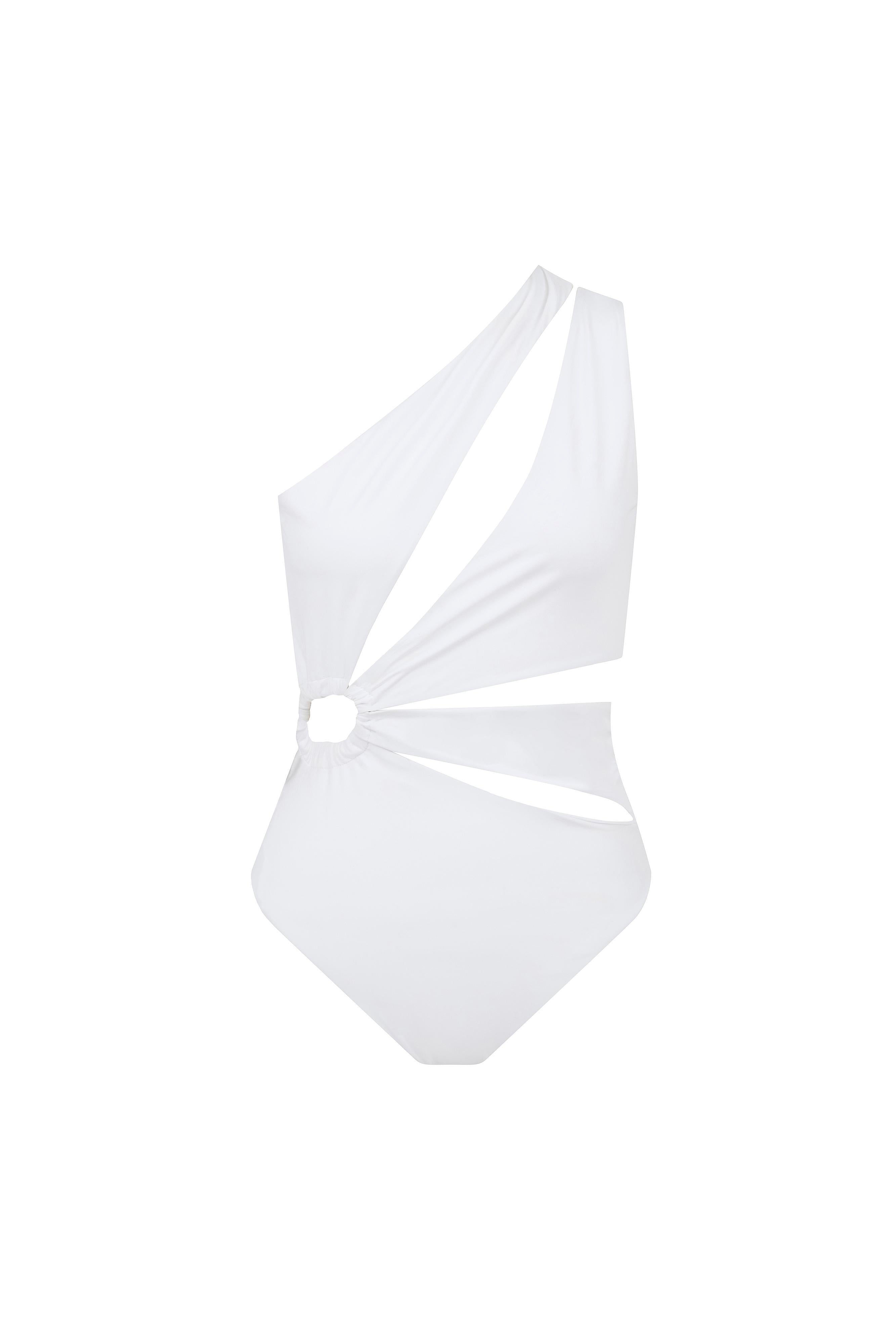 Cut out in all the right places to enhance your silhouette and show off your curves, The Cara is a season must have. Made from our gorgeous Italian eco lycra it features a one shoulder style, open details and a metal ring at the front to bring in your waist.